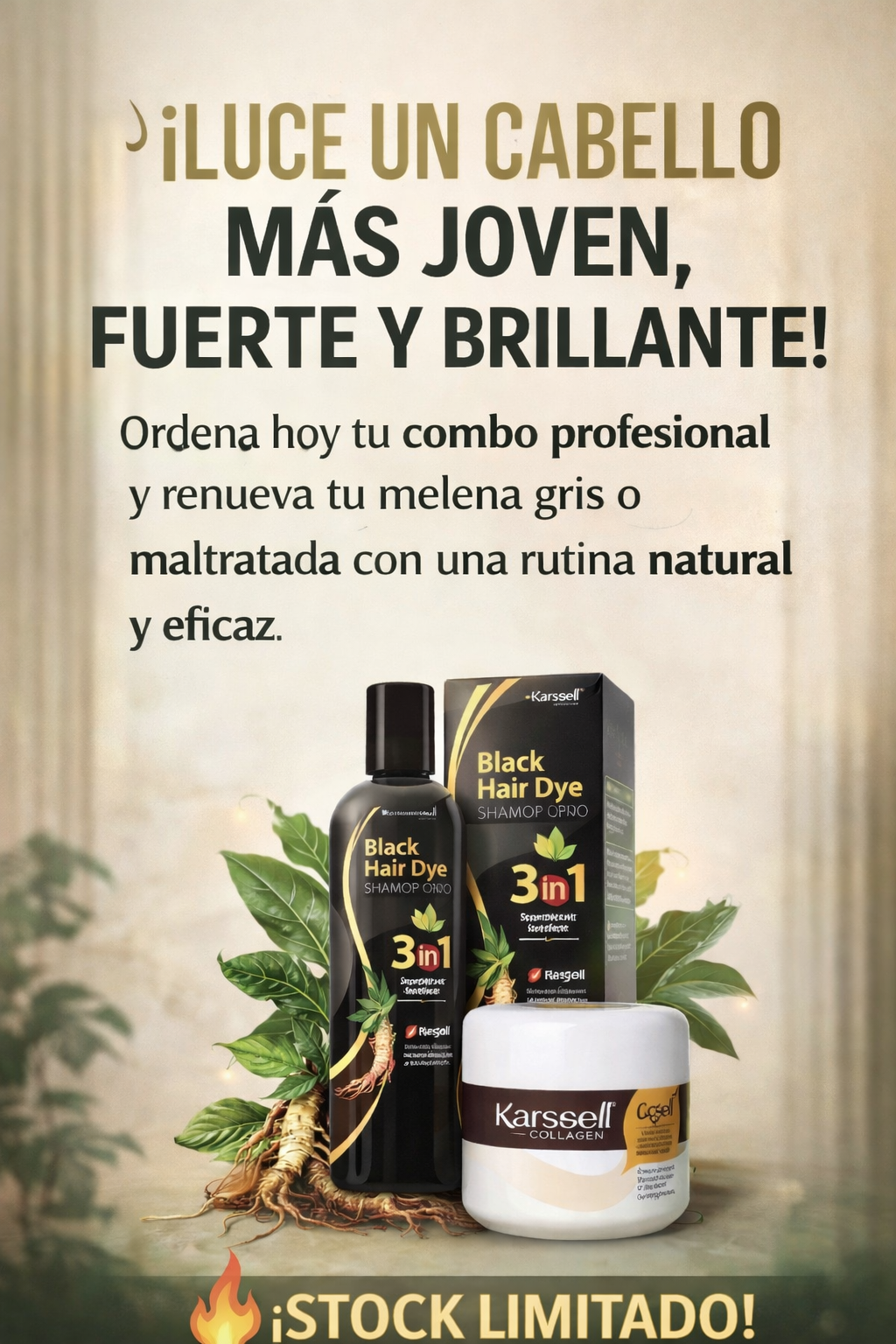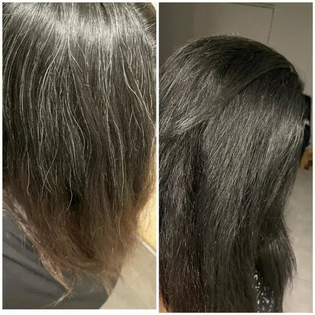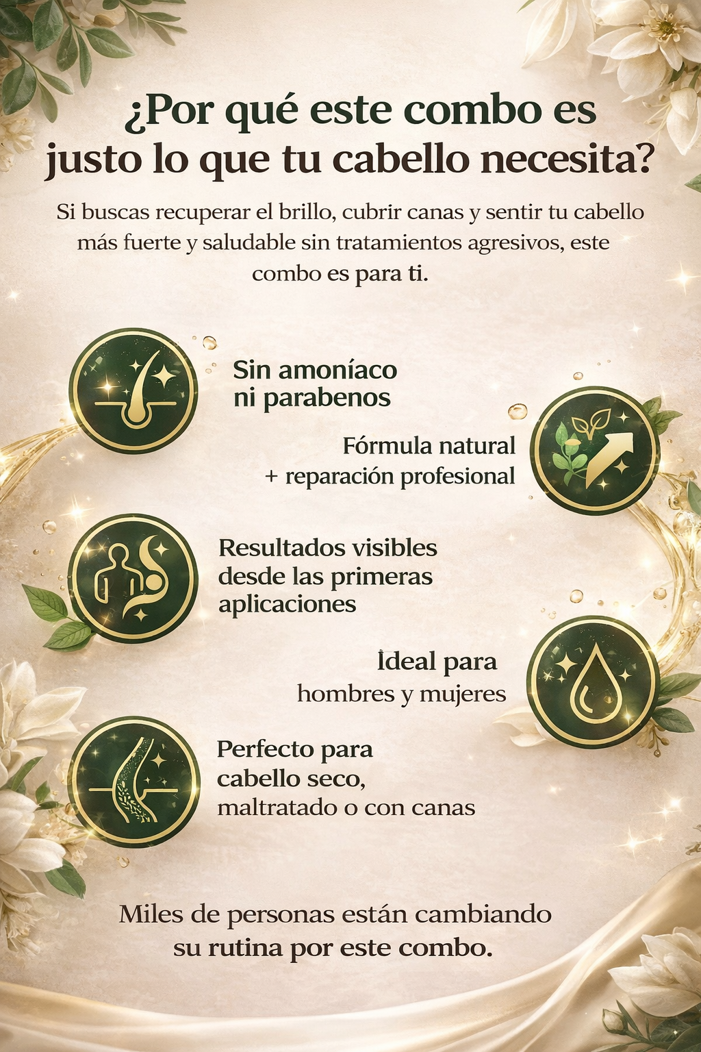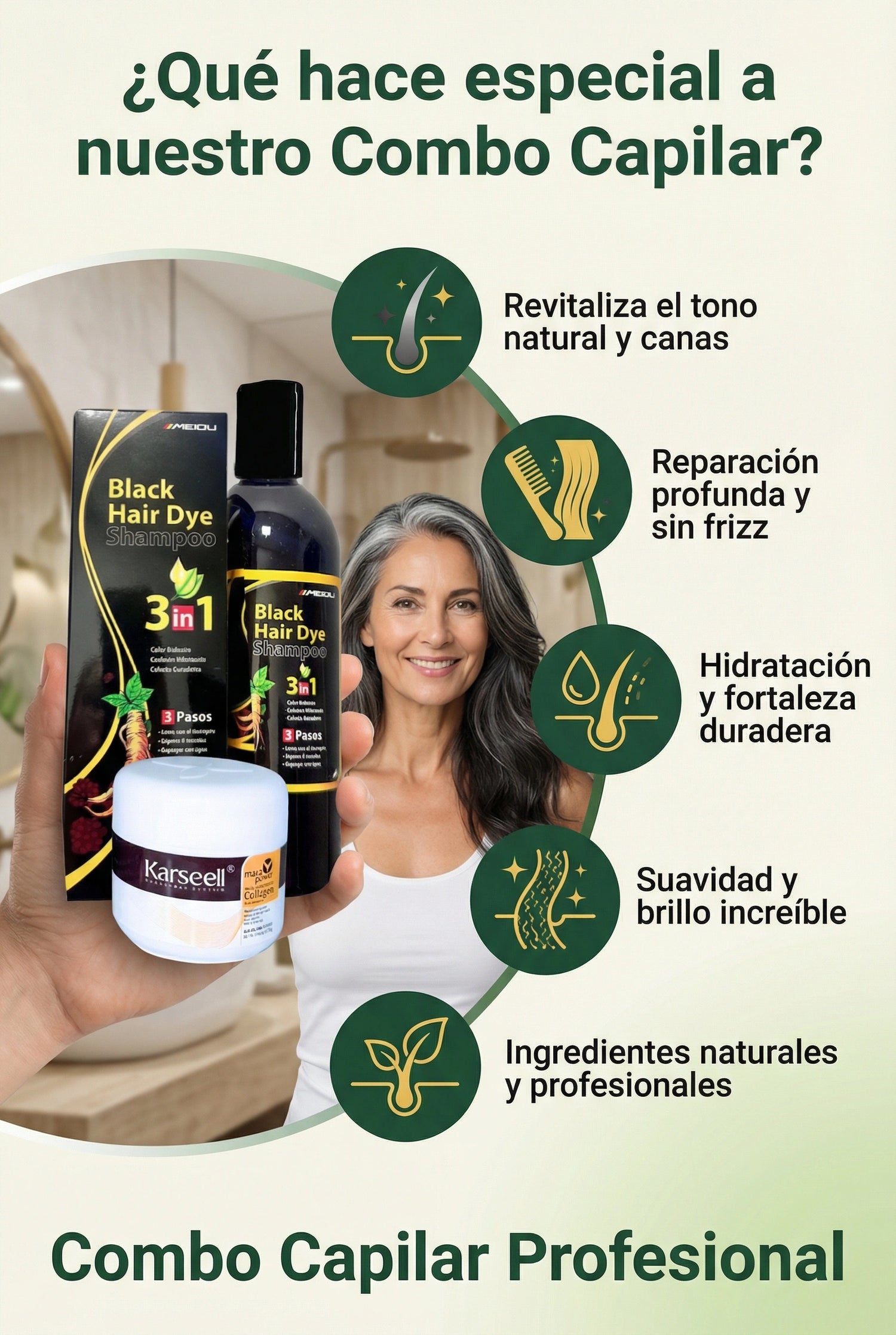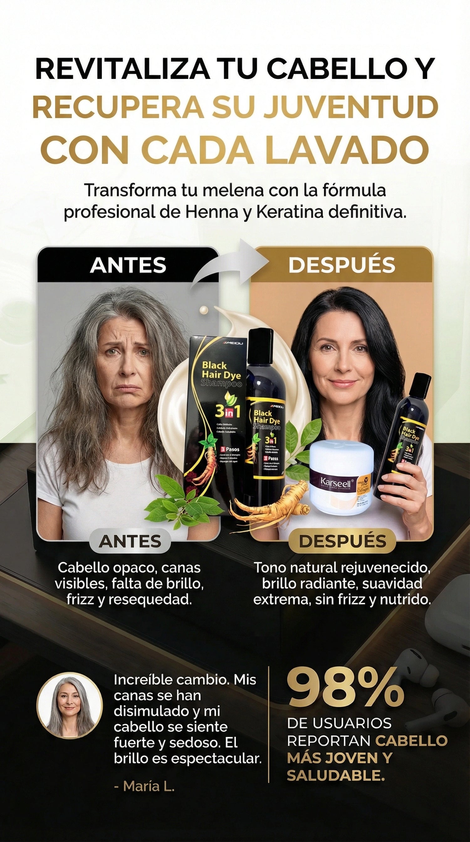 Tenía muchas canas y el cabello súper reseco. Después de usar el combo noté el cambio desde la primera semana: el tono se ve más uniforme, el cabello suave y con un brillo increíble. Me encanta porque se ve natural y no maltrata
